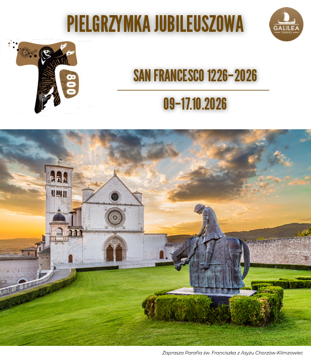 W Roku św. Franciszka z Asyżu zapraszamy na pielgrzymkę parafialną do Włoch. Odbędzie się ona w dniach 9.10-17.10.2026.. Szczegóły pielgrzymki znajdują się na stronie internetowej parafii oraz na plakatach w gablotkach. Zapisy w kancelarii parafialnej oraz u o. Olafa.